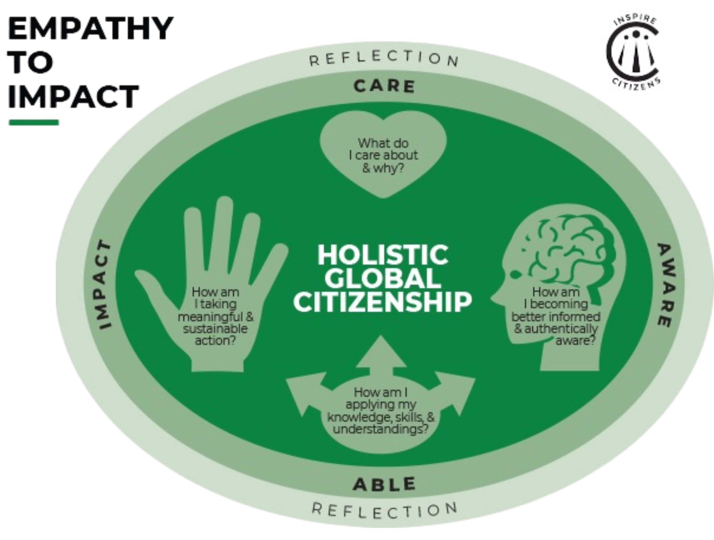 Diagram of Inspire Citizens’ Empathy to Impact Design Framework, a whole-school approach that embeds student agency, social impact projects, service learning, global citizenship, and experiential learning into curriculum, co-curricular programs, and community partnerships.